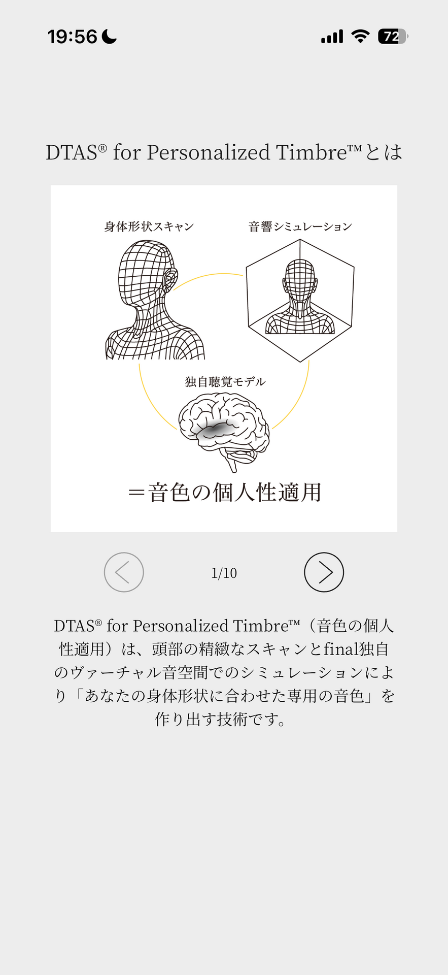 しかし効果は高かったものの、「自分ダミーヘッド」はオプション価格も高価で、final本社の測定機器を使うために手軽なものとは言えませんでした。finalはそれをより手軽に自分の家でスマホを使って測定可能として、「DTAS」という第二世代技術を開発しました。また中の技術もJDHから改良されているようです。