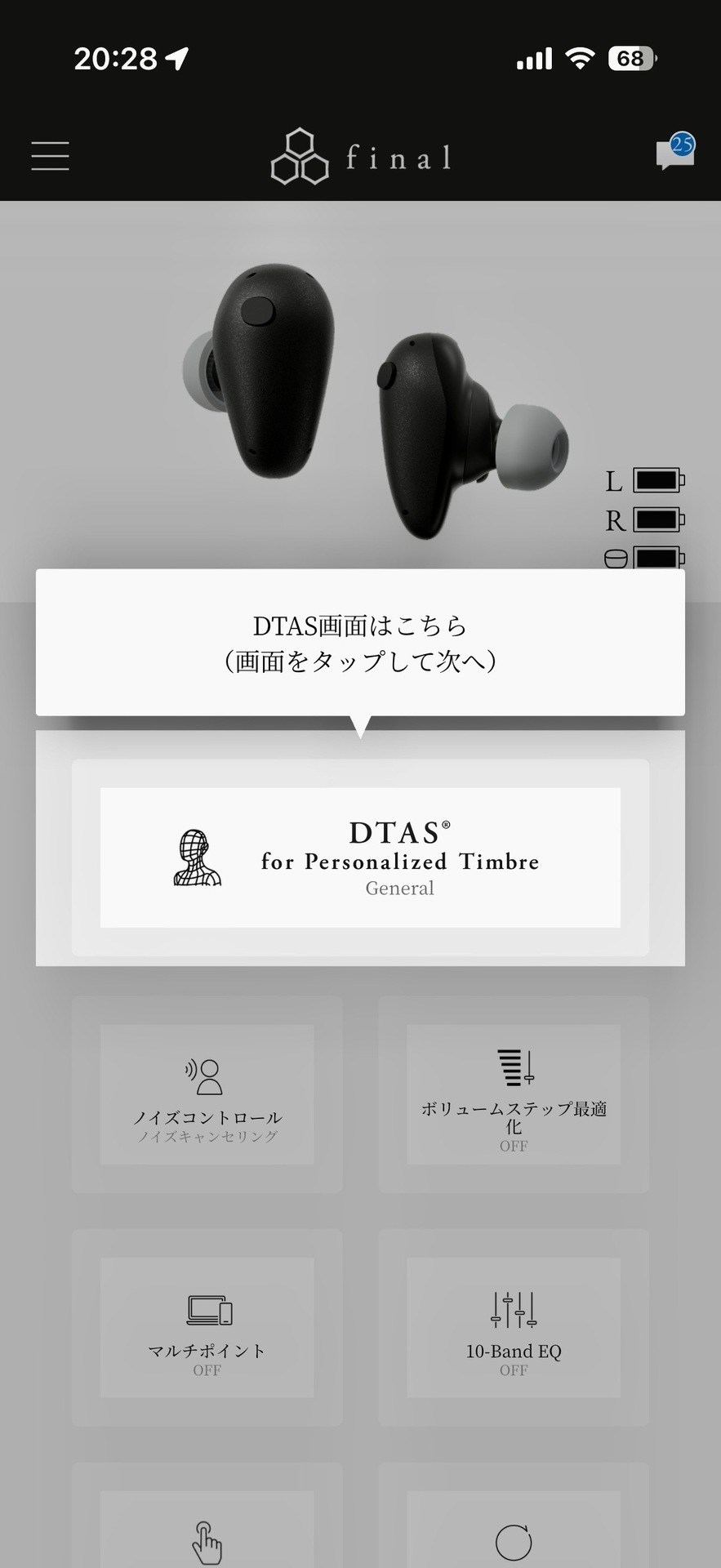 そして「DTAS」を適用した新規開発のフラッグシップTWSが「TONALITE(トナリテ)」です。パーソナライズは手持ちのスマホ(iPhone/Android)で、finalのアプリを使用して行います。